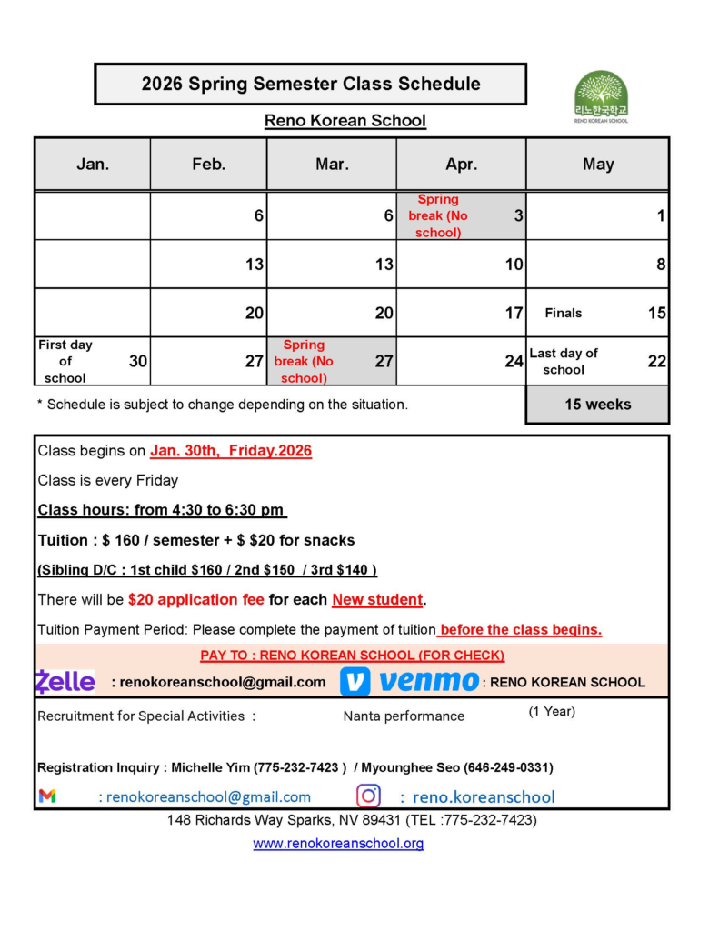 개강일 : 2026년 1월 30일 금요일 오후 4:30-6:30 (간식시간 포함)Class begins on Jan 30th, Friday. 2026Class hours: from 4:30 to 6:30 pm (30 min. break for snack)등록 문의 Contact : renokoreanschool@gmail.com775-232-7423 (Michelle Yim)